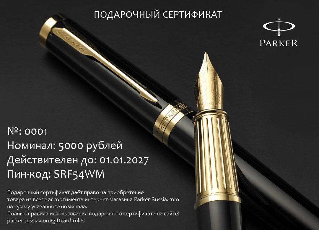 Подарочный сертификат Parker 5000 от официального дилера Parker в Нижнем Новгороде. Вы можете дополнительно заказать гравировку, которая подчеркнет Вашу оригинальность и придаст памятность статусному подарку. Все ручки Паркер поставляются в фирменном футляре.